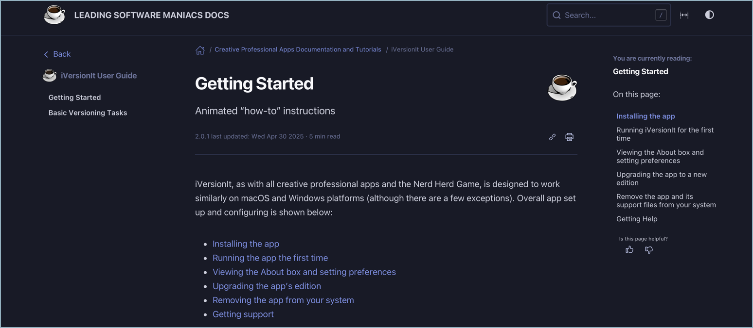 Click to view an example of a software product’s quick start and user guide created for the iVersionIt app: